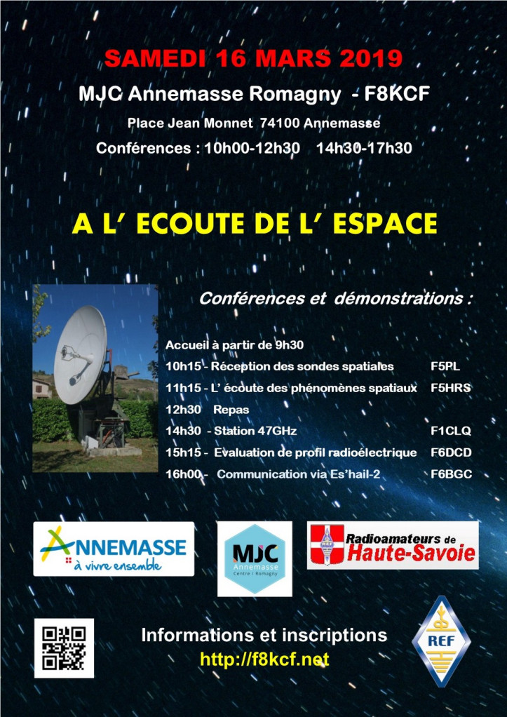 Le Radio Club F8KCF de la MJC d’Annemasse Romagny et les Radio Amateurs de Haute-Savoie REF74 organisent le Samedi 16 Mars 2019 une Journée Technique sur le thème  : A l’écoute de l’Espace