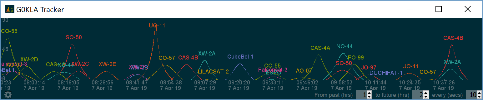 Chris Thompson, G0KLA/AC2CZ indique sur son son site : « Je voulais un programme simple qui montre quand les engins spatiaux cibles seraient au-dessus de l’horizon. Je me suis souvenu d’une photo d’un vieux programme que Rob Bruninga a posté sur AMSAT-BB. Je n’ai pas pu trouver cette photo, mais j’ai construit quelque chose de similaire. Il s’agit d’un programme simple qui trace l’altitude des prochains passages de satellites et la met à jour en temps réel. »