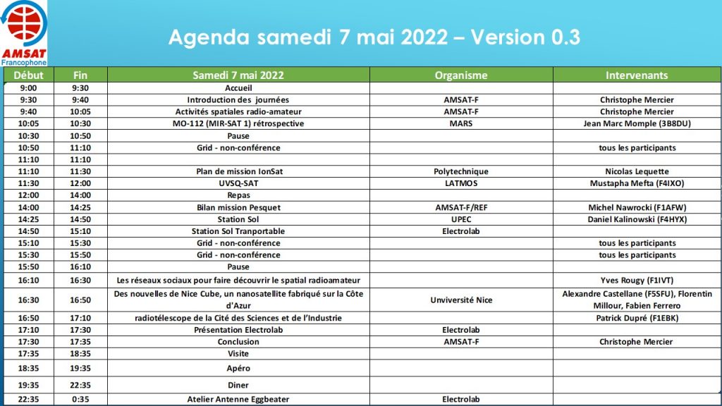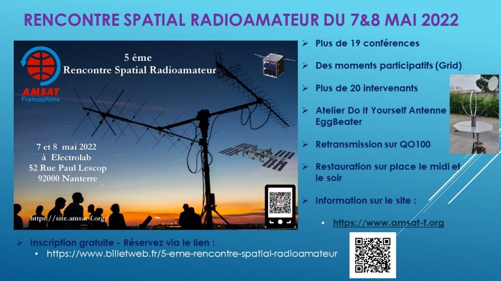 L’AMSAT-Francophone, organise dans le cadre de son assemblée générale, la cinquième rencontre spatiale radioamateur les 7 et 8 mai 2022.