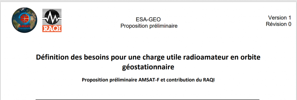 - Version française : Proposition préliminaire AMSAT-F - RAQI à l'appel à projet ESA - GEO (version française) (5779 téléchargements )